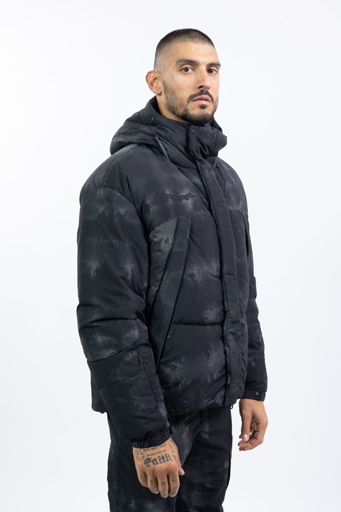 JG1 black Outerwear down jacket with frontal zip and buttons closure, hood detail with coulisse, long sleeves, maxi zip pocket, padded