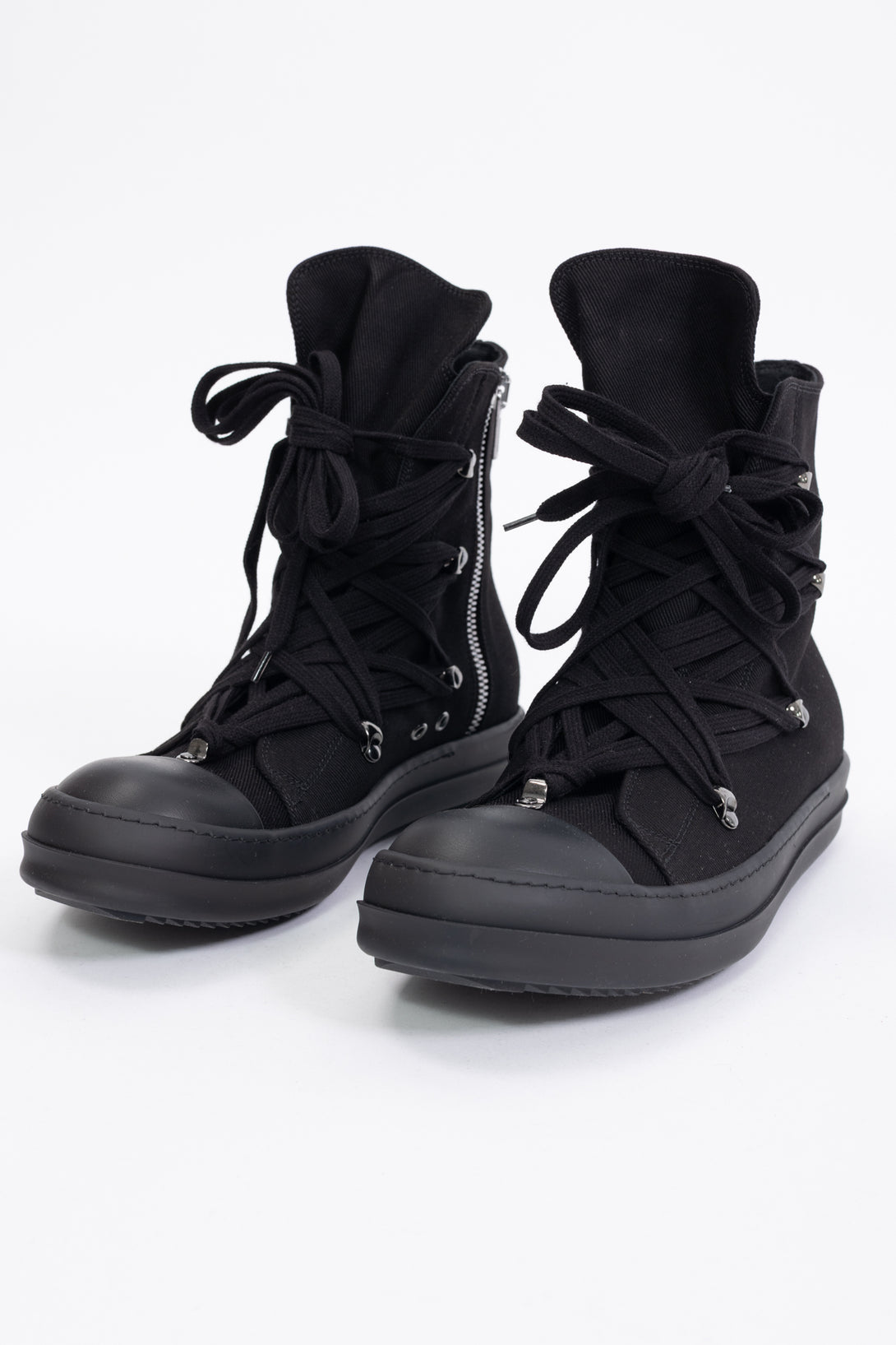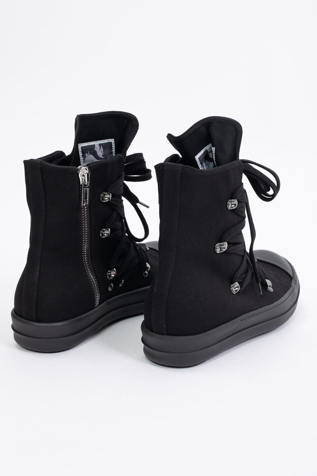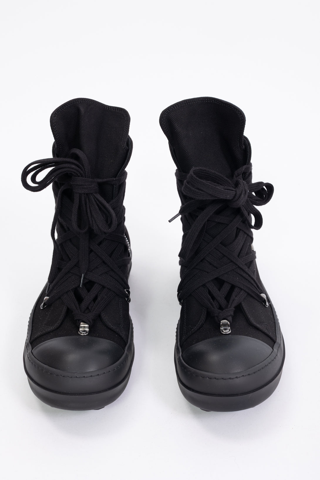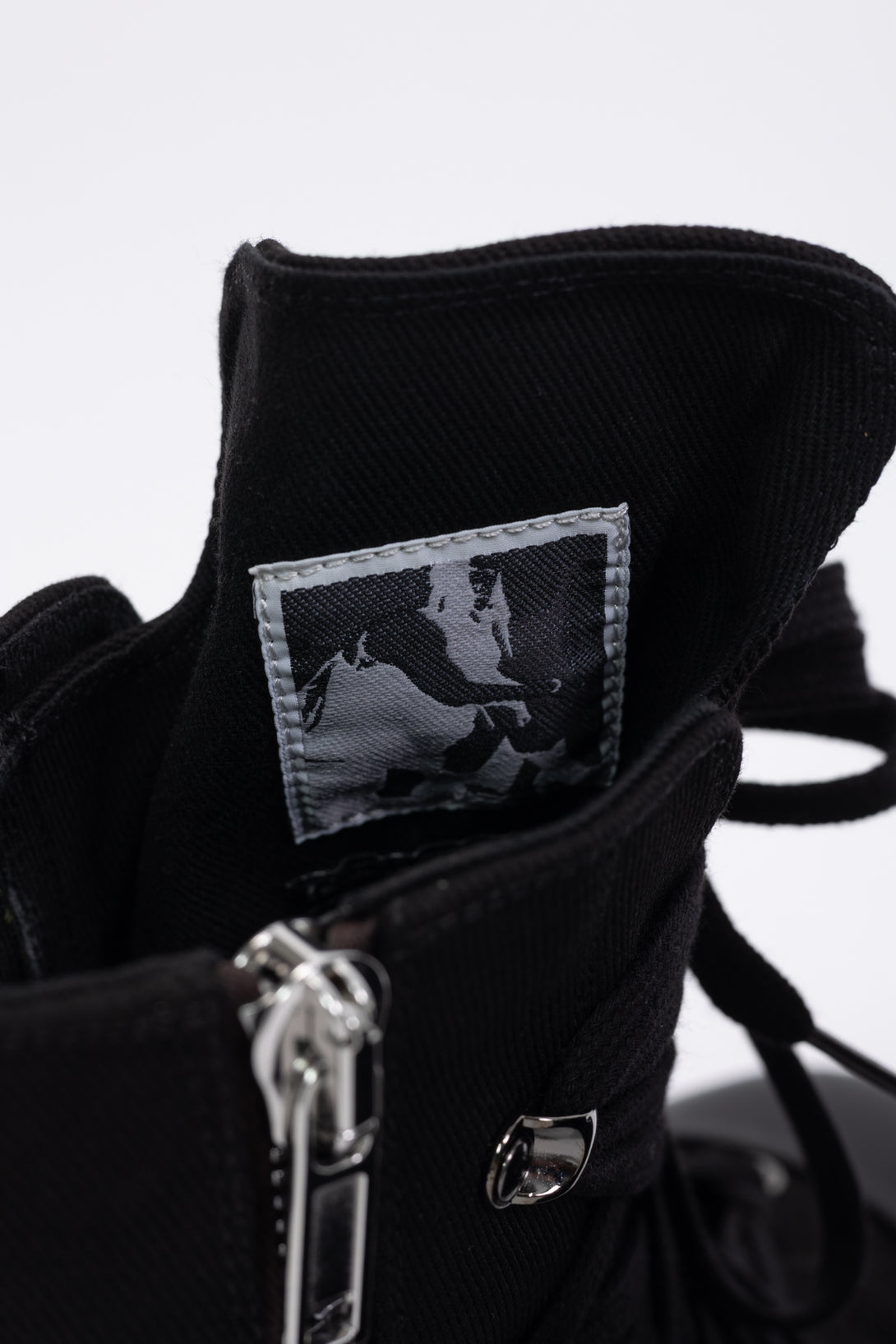 THESE MEGALACE® SNEAKS ARE ABOVE-ANKLE HEIGHT AND FEATURE SEVEN EYELETS, MEGALACE® DETAIL, A ZIPPER ON THE INSIDE ANKLE FOR EASY FASTENING, TOE CAPS AND SHARK-TOOTHED BUMPER SOLES