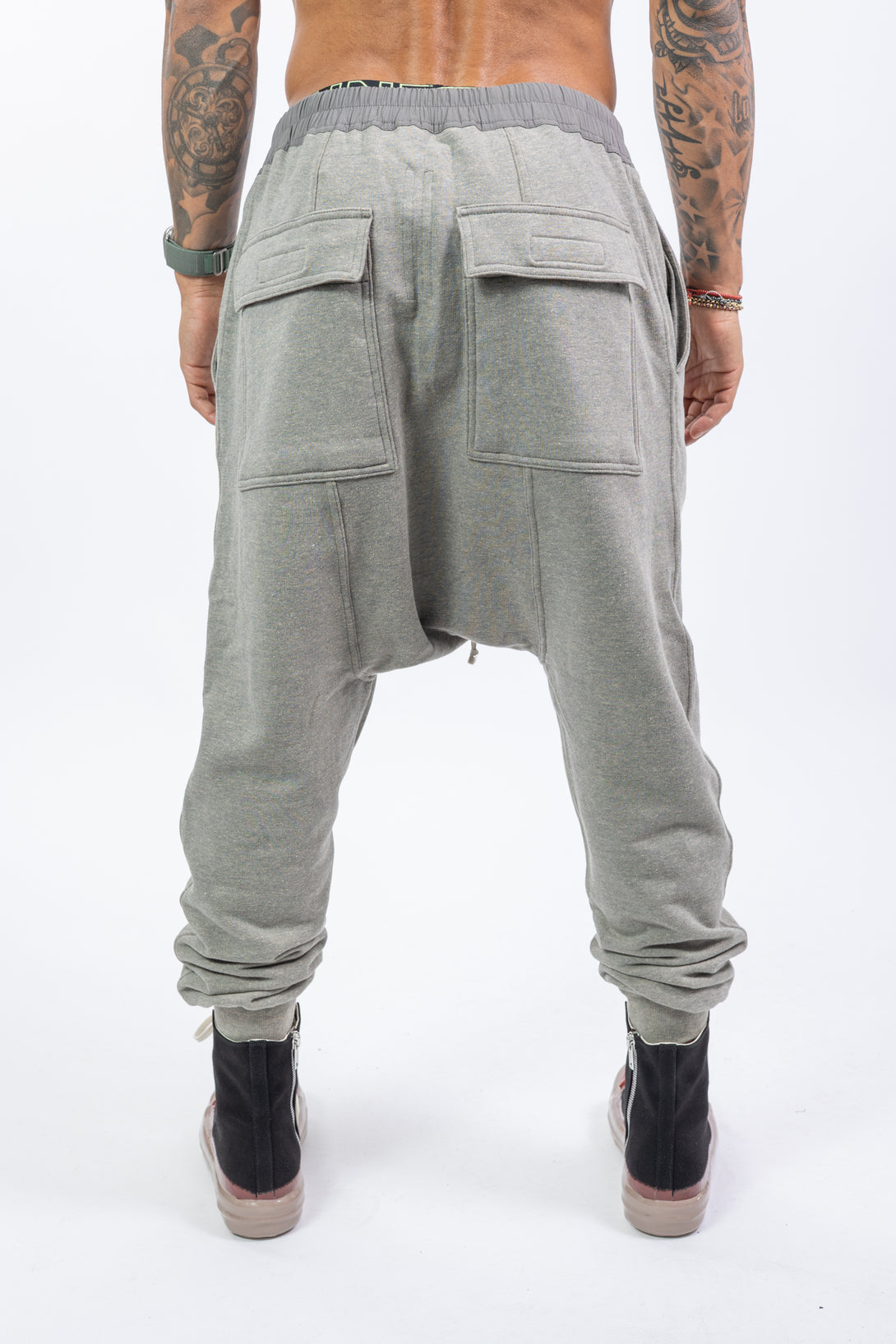 THESE PRISONER DRAWSTRING PANTS ARE FULL LENGTH, WITH A RELAXED DROPPED CROTCH AND SLIM CUT LEGS. THEY HAVE AN ELASTICIZED WAISTBAND WITH DRAWSTRING AND STITCHED FLY, RIBBED ANKLE CUFFS, FRONT SIDE SEAM POCKETS AND SQUARE BACK POCKETS WITH FLAPS AND TOPSTITCHING. THEY FEATURE A CURVED YOKE SEAM RUNNING ACROSS THE FRONT AND DOWN EACH LEG.