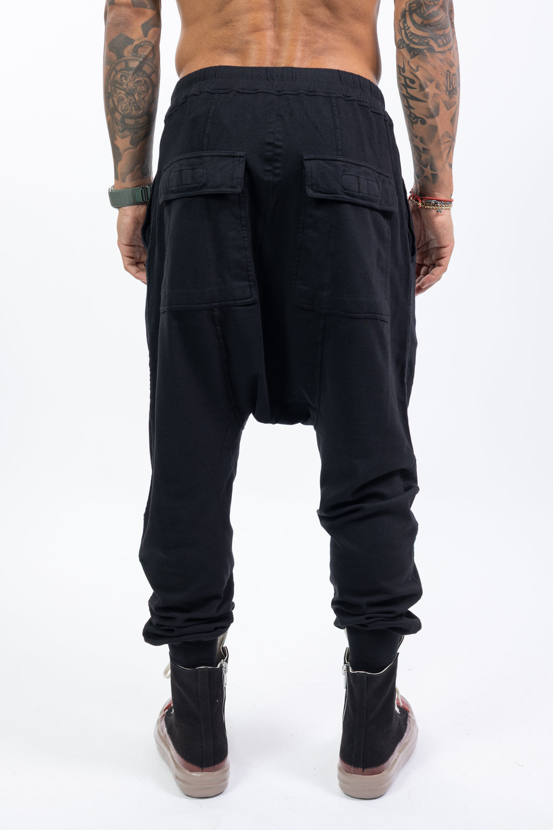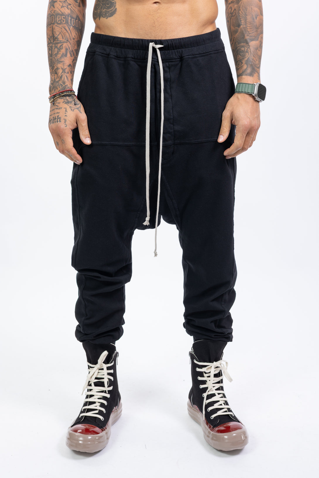 THESE PRISONER DRAWSTRING PANTS ARE FULL LENGTH, WITH A RELAXED DROPPED CROTCH AND SLIM CUT LEGS. THEY HAVE AN ELASTICIZED WAISTBAND WITH DRAWSTRING AND STITCHED FLY, RIBBED ANKLE CUFFS, FRONT SIDE SEAM POCKETS AND SQUARE BACK POCKETS WITH FLAPS AND TOPSTITCHING. THEY FEATURE A CURVED YOKE SEAM RUNNING ACROSS THE FRONT AND DOWN EACH LEG.