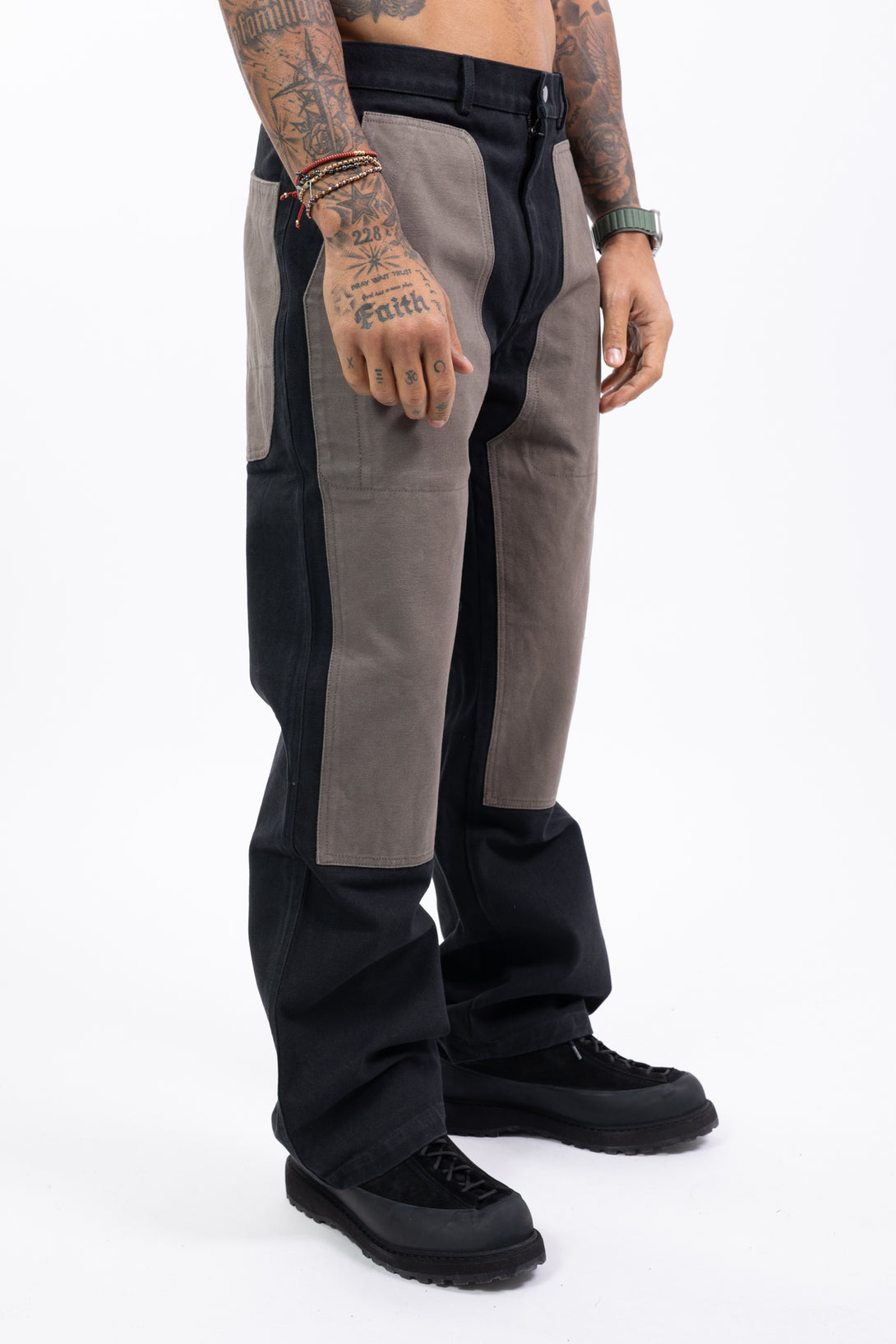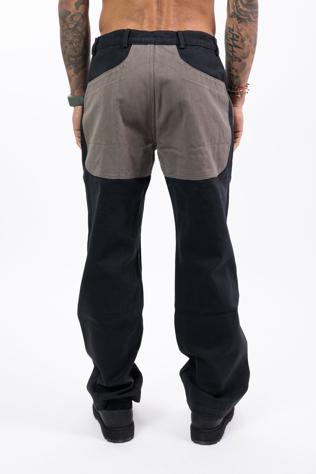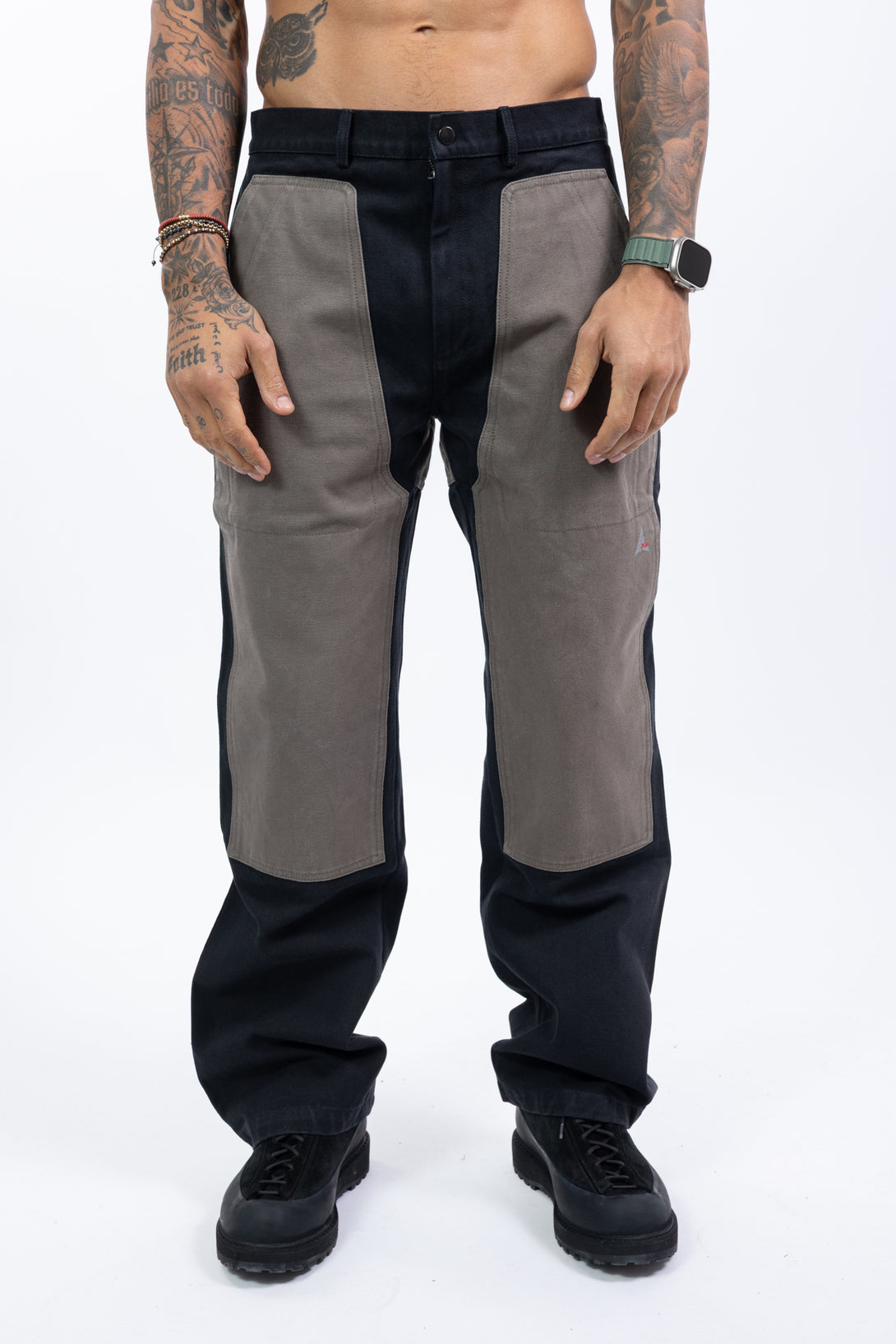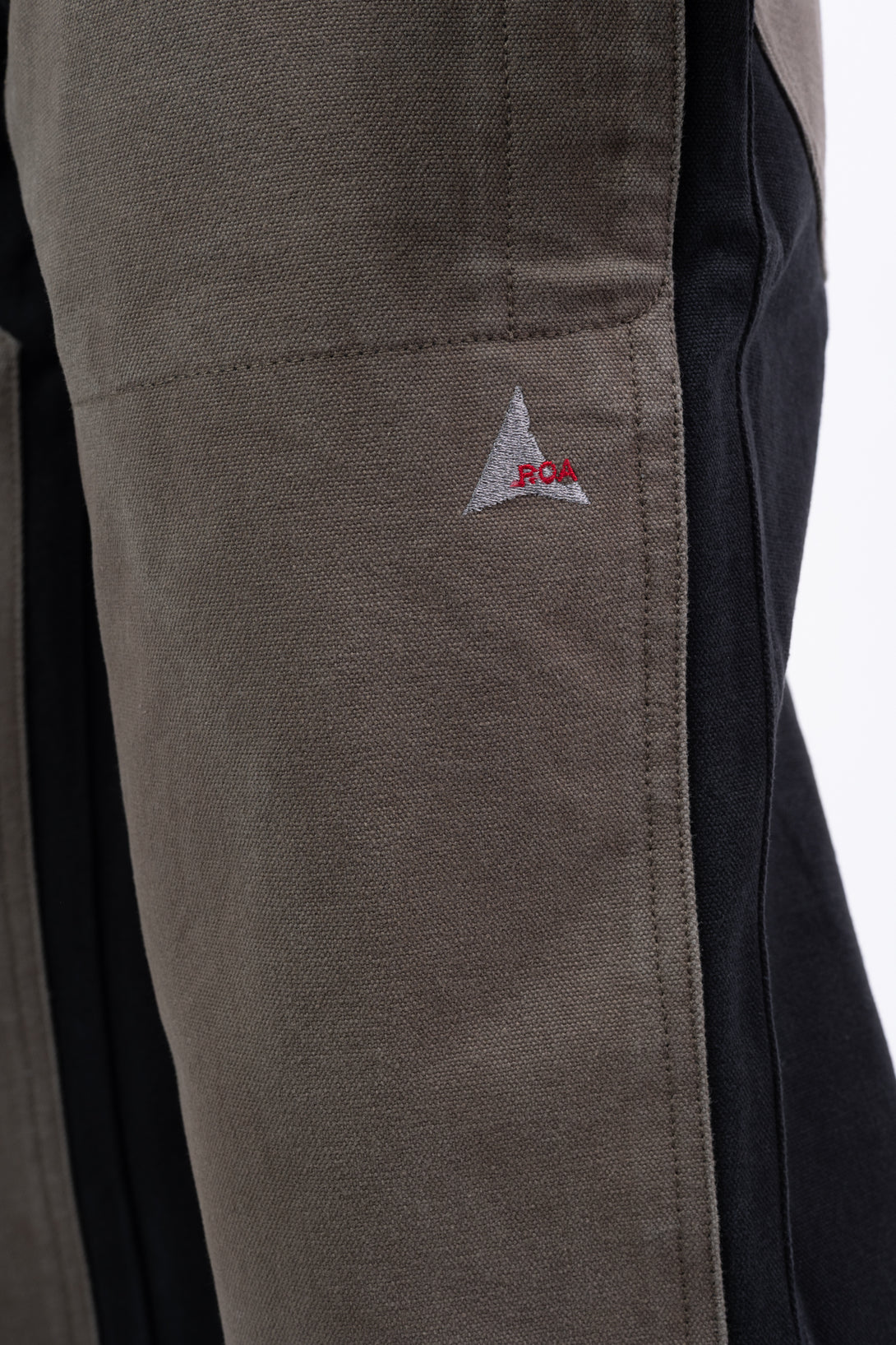 The Fomes Double Knee Washed Canvas pant in black and grey color is crafted from heavy cotton canvas, offering durability and comfort for everyday wear. The washed garment treatment gives it a soft, worn-in feel. Double canvas reinforcement on the front and back. Designed with a loose fit, and an embroidered ROA logo on the front.