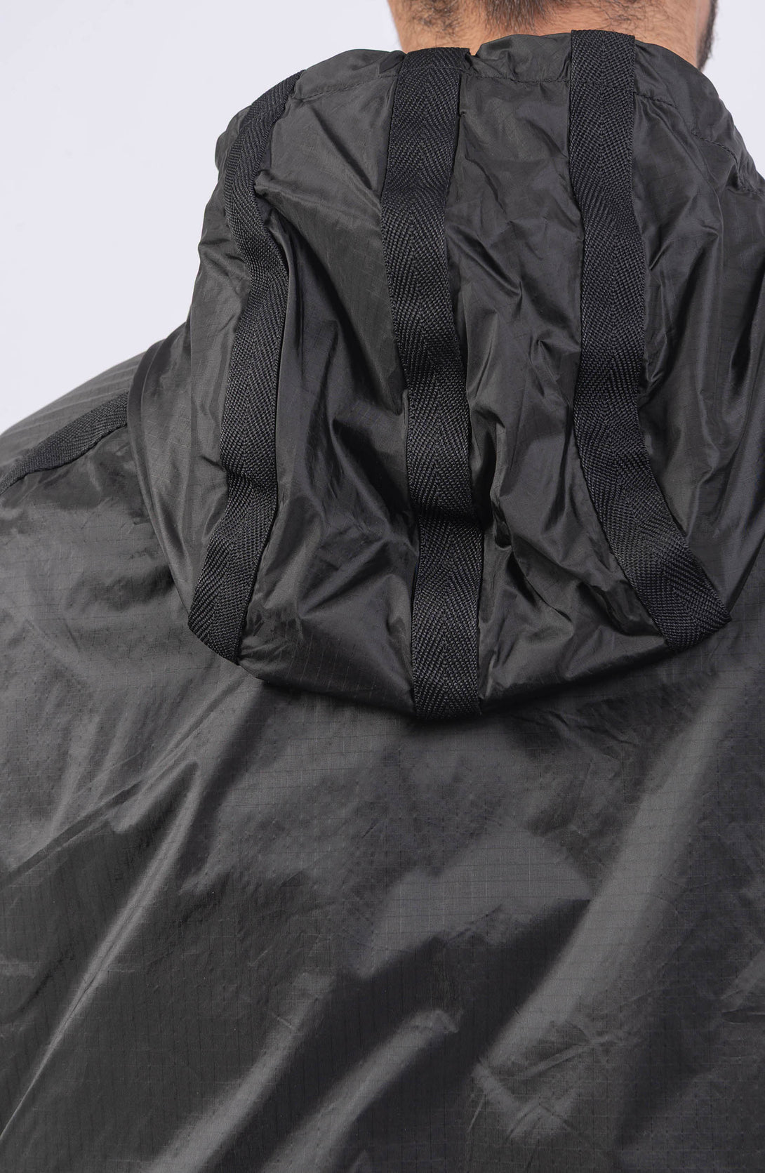 Light hooded jacket in a high-tenacity ripstop nylon 6.6 that is lightweight yet extremely durable. The semi-transparent fabric is double layered on some parts of the garment, highlighting its geometry. Treated with a specific anti-drop agent.
