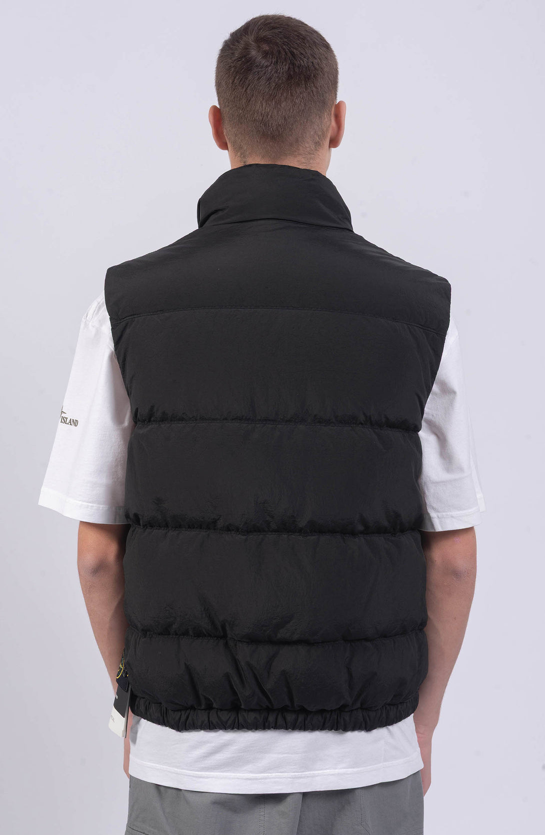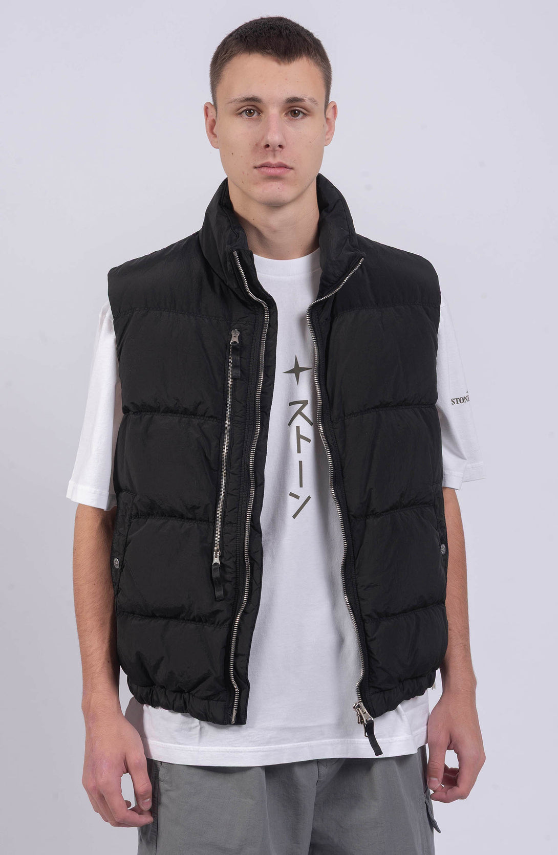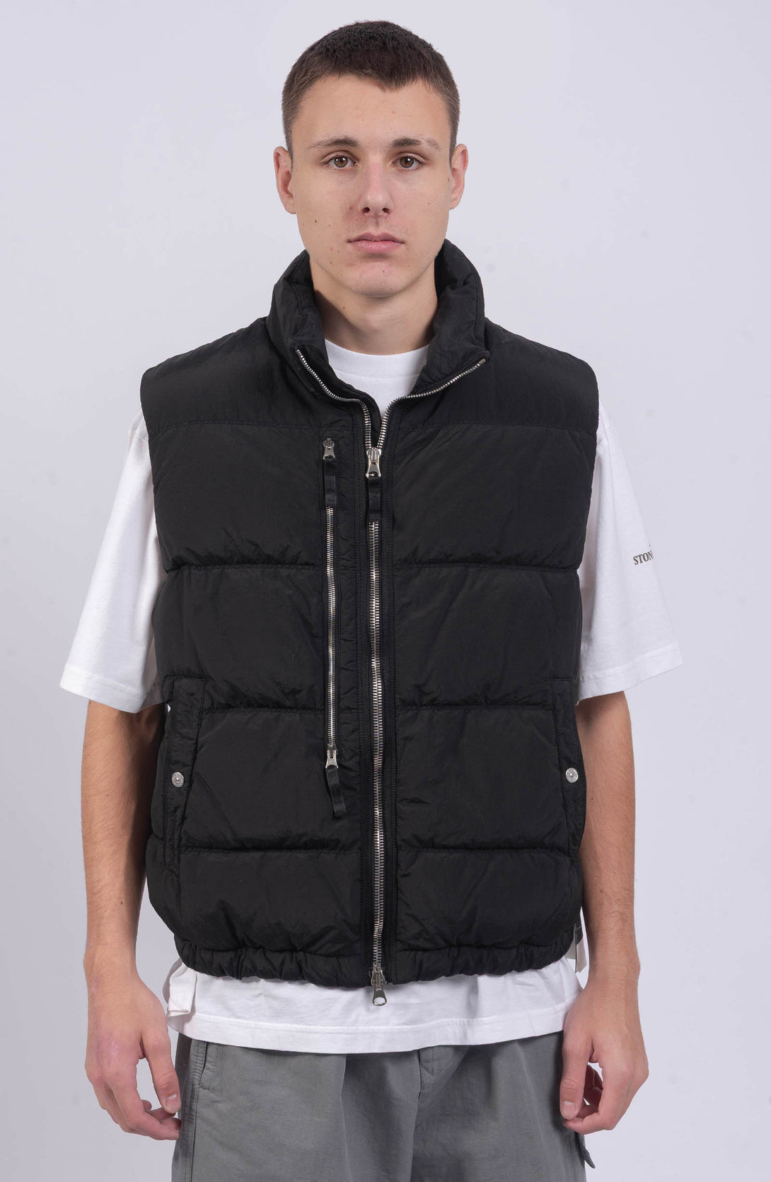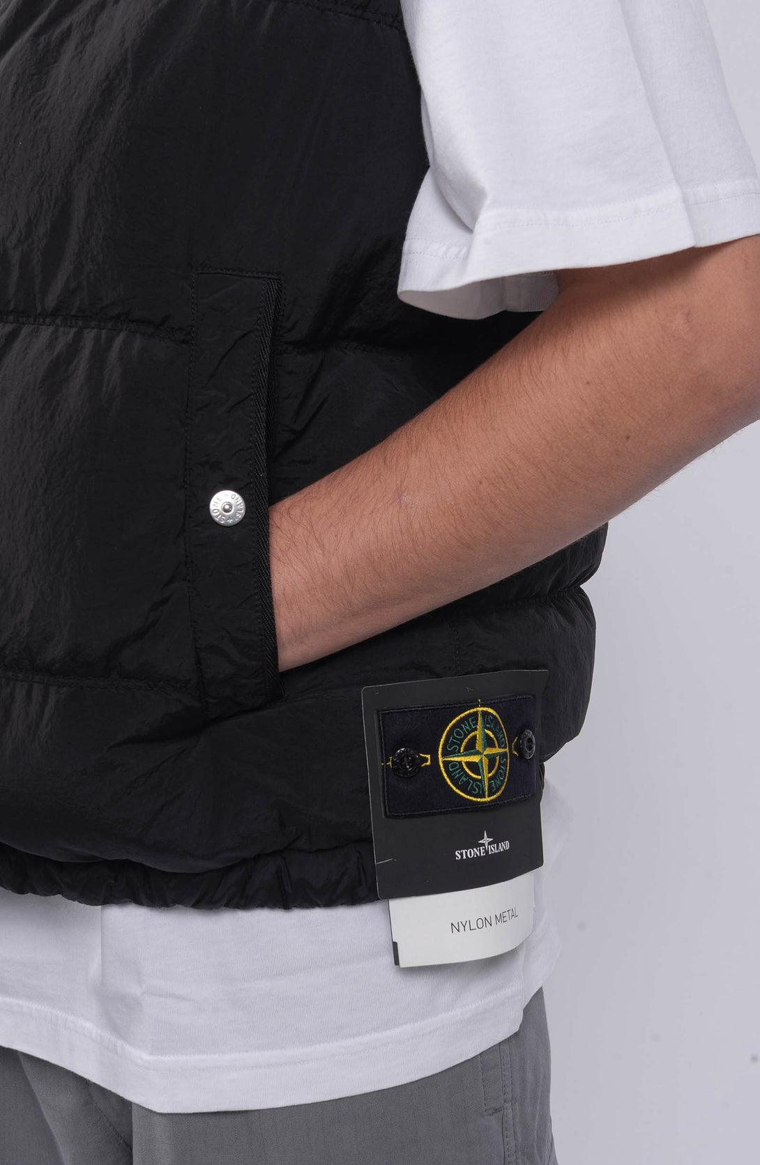 Down vest in Stone Island's iridescent Nylon Metal fabric. The evolution of this iconic fabric sees the use of ECONYL® regenerated yarns: the life ended nylon, pre- and post-consumer, is recycled with a complex depolymerization process to create this fibre that features the same intrinsic characteristics of nylon from fossil raw material. Garment dyed with a double colour recipe and the addition of a special anti-drop agent. Padded with the finest feathers specifically treated to withstand the garment dyeing procedure. RDS - Responsible Down Standard certified.