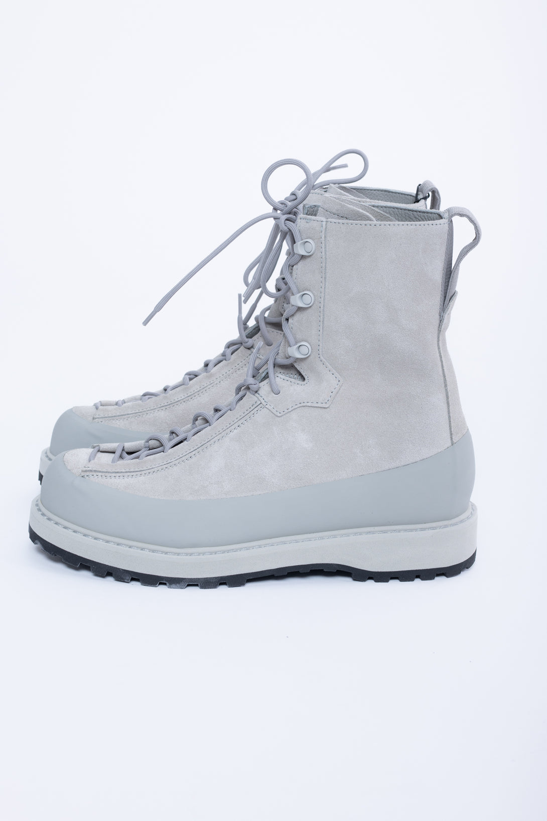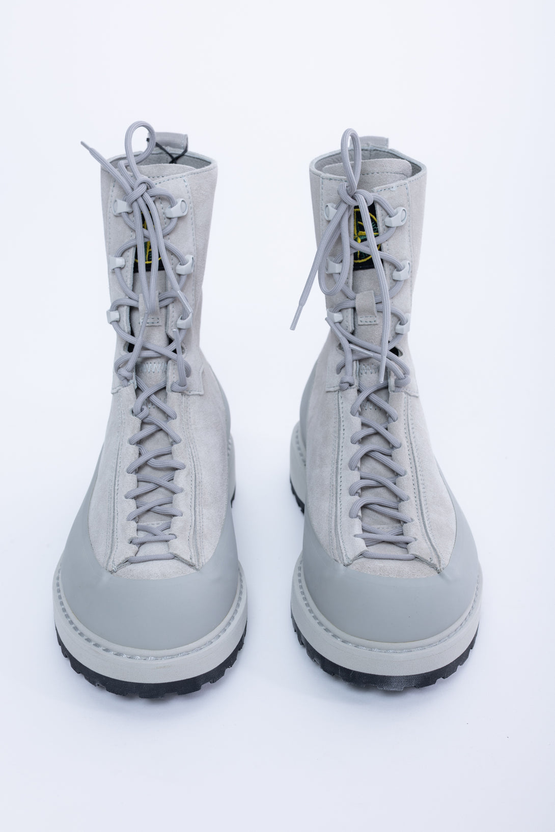 Metal loops and hooks with nylon cord lacing. Second lace that runs parallel to main lacing on lower half. Stone Island Compass logo patch on tongue. Tape loop on back. Contour rubber rand. Lug sole.