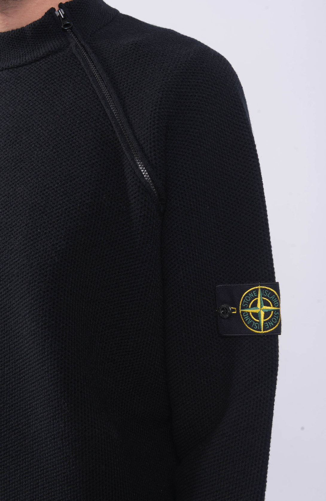 Mock neckline with diagonal zip fastening on left side. Raglan sleeves. Stocking stitch band creating a frame on front and under sleeves and panel above back bottom hem. Stone Island badge on left sleeve. Ribbed cuffs and bottom band. Loose fit.