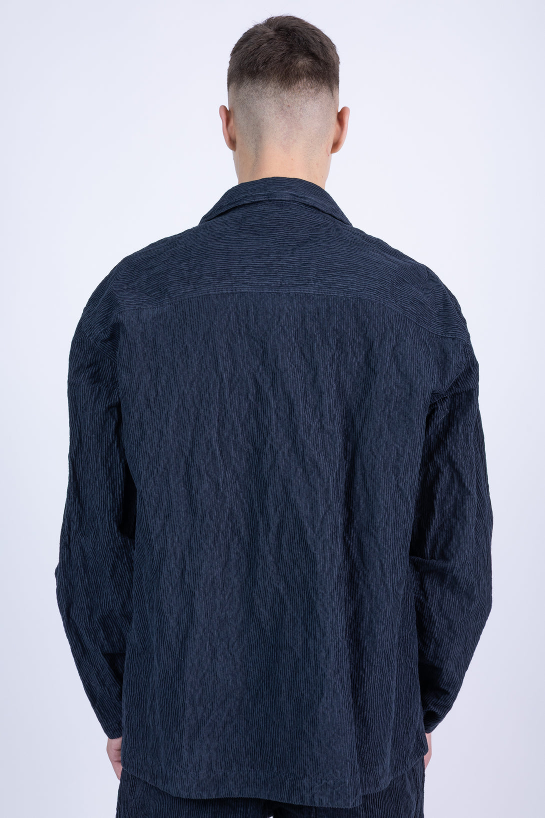 Overshirt in cotton-nylon corduroy 500. The weave is made with a monofilament nylon that lends a springy hand and a wrinkled appearance to the fabric. Garment dyed.